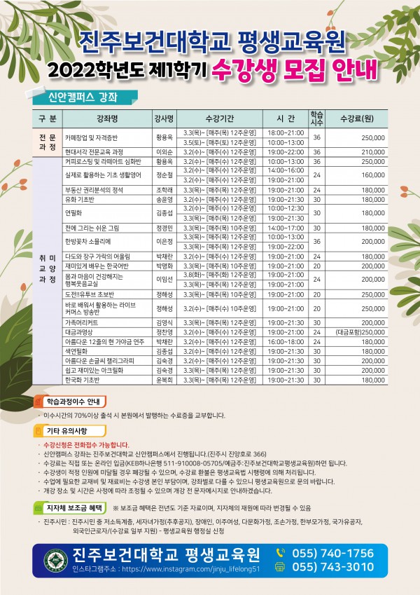 진주보건대학교 부설평생교육원 일반과정 수강생 모집안내