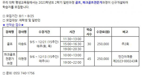 2023-2학기 평생교육원 골프, 파크골프전문가 신규개설 안내