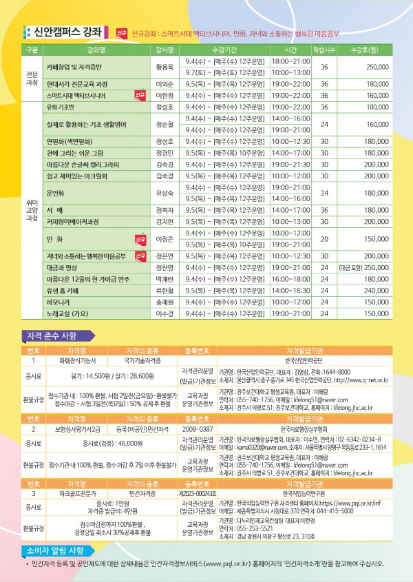- 수강생이 적정 인원에 미달되면 폐강되며 수강료 환불은 개강 전까지 가능합니다.