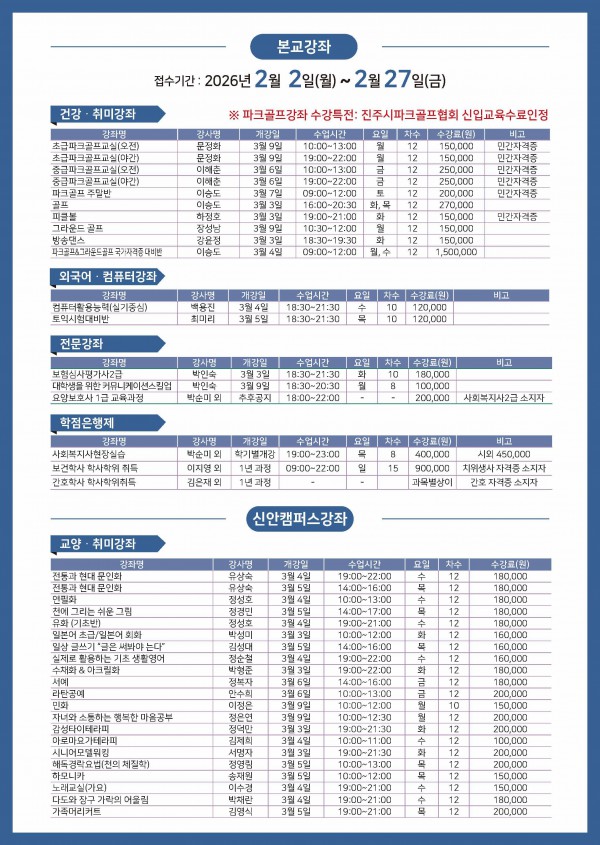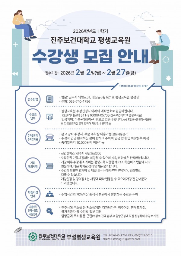 - 납부기한: 2026년 2월 2일(월) ~ 2026년 2월 27일(금)까지- 납부계좌: KEB하나은행 511-910008-05705(예금주:진주보건대학교평생교육원)