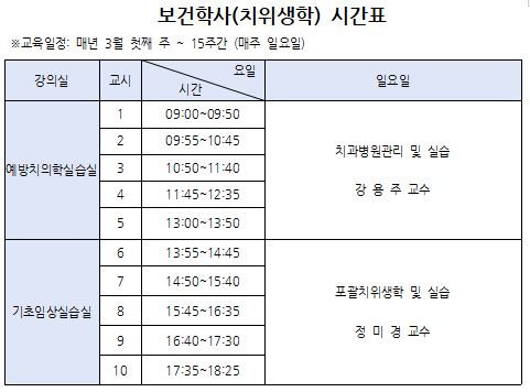 보건학사(치위생학) 시간표 ※교육일정: 매년 3월 첫째 주 ~ 15주간 (매주 일요일)